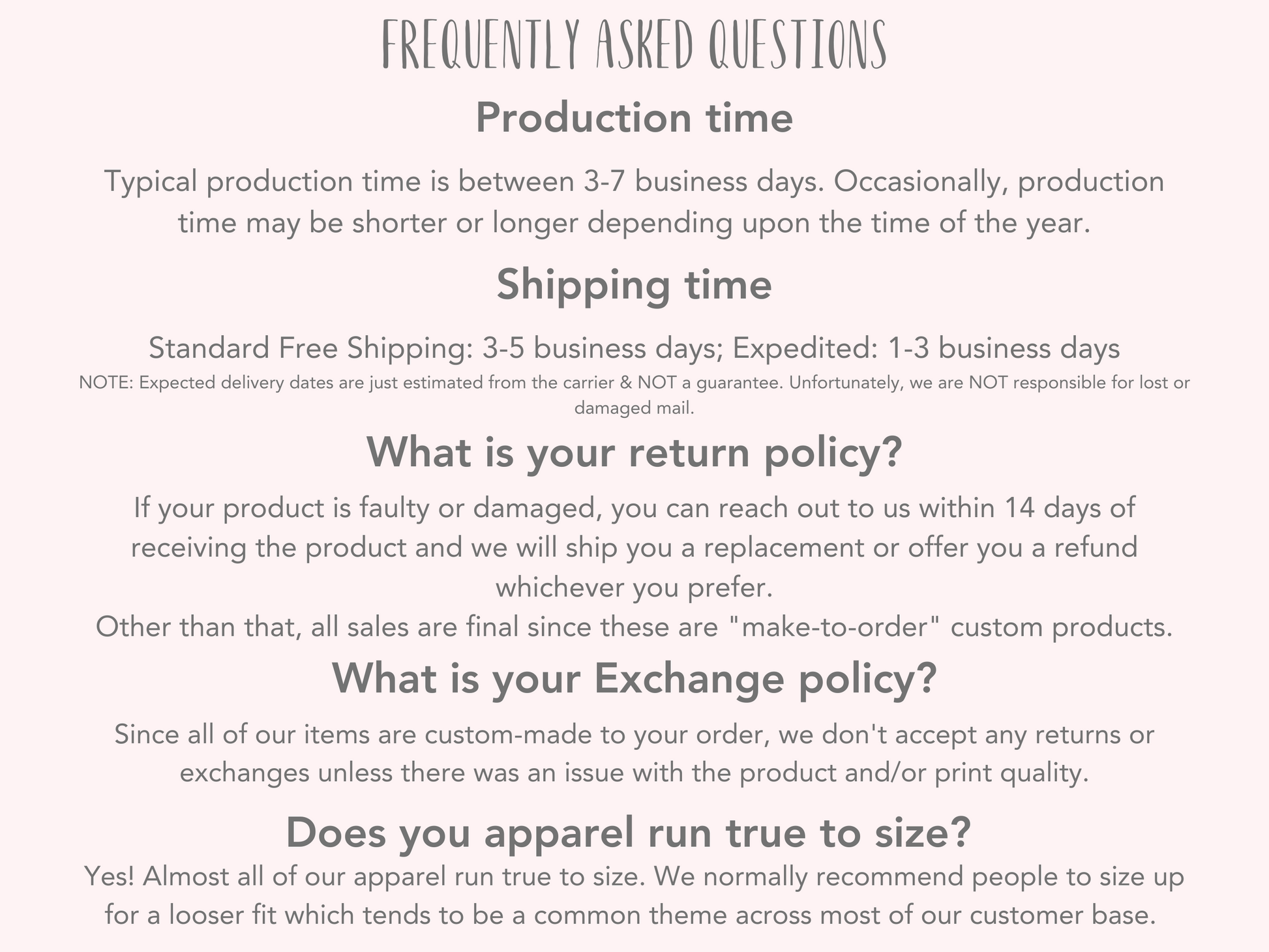 We would like to highlight that all the products you see in our store are custom made which means, our products are NOT pre-made and stored in bulk. As a result we are UNABLE to offer any type of free returns other than if the item/s is/are faulty.